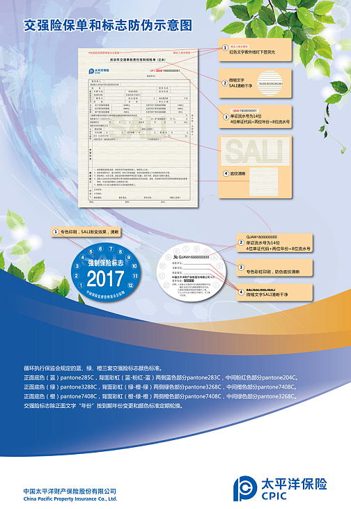 一看,識(shí)別單證真?zhèn)?。要仔?xì)辨別單證是否具有監(jiān)管要求的防偽技術(shù)。一是,交強(qiáng)險(xiǎn)單證正本左上角“中國保險(xiǎn)監(jiān)督管理委員會(huì)監(jiān)制”、右上角“限在×××銷售”字樣,并應(yīng)使用紅色熒光防偽油墨,在紫外燈下發(fā)紅色;二是,交強(qiáng)險(xiǎn)單證標(biāo)題下有一條以“SALI”為內(nèi)容的微縮文字形成的橫線,與標(biāo)題等長,在5-10倍以上放大鏡下清楚可辨;三是,交強(qiáng)險(xiǎn)單證滿版由轎車和貨車圖案做浮雕底紋,中間可見光柵效果的“SALI”四個(gè)字母。