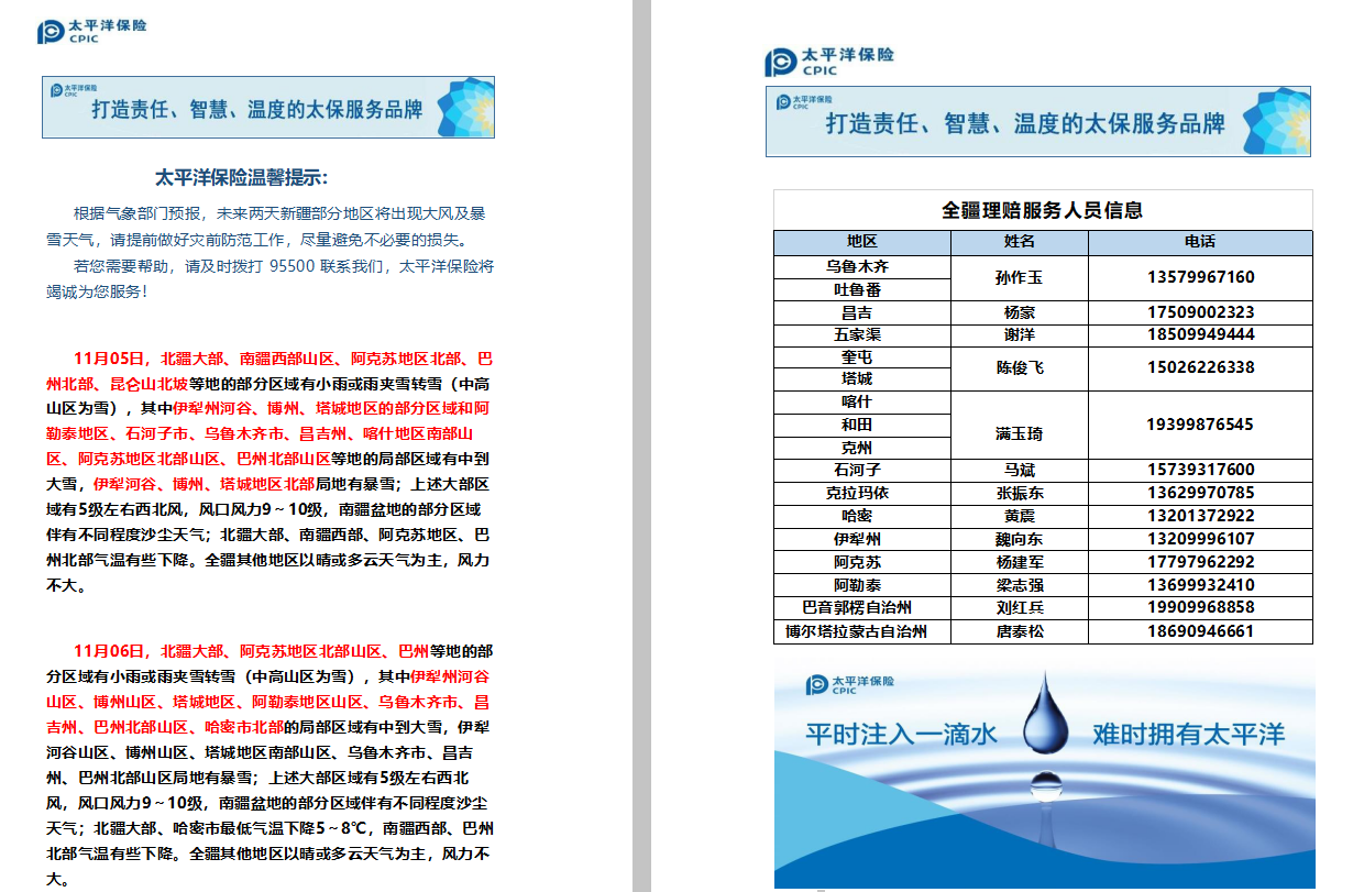 未來兩天新疆部分地區(qū)將出現(xiàn)大風(fēng)及暴雪預(yù)警,請注意防范。如需幫助,請致電95500全國客服電話或直接撥打全疆理賠服務(wù)電話 ? 太平洋保險在您身邊!
