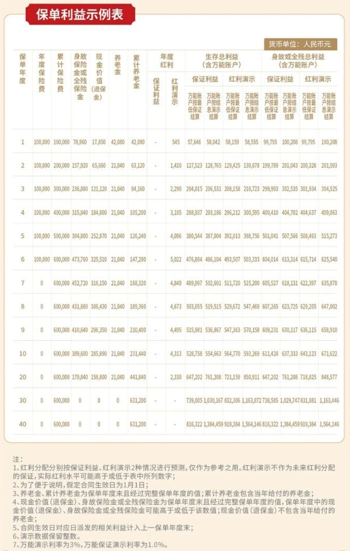 注:1.保險(xiǎn)期間屆滿時(shí)不再給付養(yǎng)老金。2.在任何情況下,身故保險(xiǎn)金和全殘保險(xiǎn)金不可兼得,即若本公司給付任何一項(xiàng)保險(xiǎn)金,另一項(xiàng)保險(xiǎn)金不再給付。