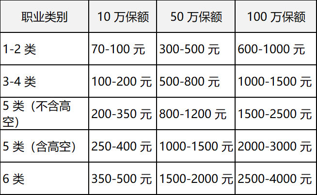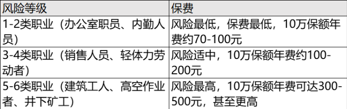 保險公司將職業(yè)劃分為1-6類,風(fēng)險等級越高,保費越高。例如: