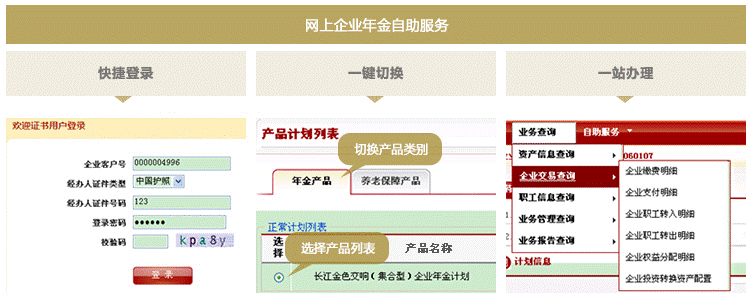 長江養(yǎng)老網(wǎng)上平臺是養(yǎng)老金行業(yè)內(nèi)首家實現(xiàn)全天候服務(wù)與全業(yè)務(wù)覆蓋的電子商務(wù)平臺。平臺全面支持企業(yè)年金、養(yǎng)老保障等養(yǎng)老金業(yè)務(wù)的辦理與查詢,可一站式滿足企業(yè)包括繳費、領(lǐng)取、人員管理、資產(chǎn)查詢、報表查詢等在內(nèi)的所有業(yè)務(wù)管理需求。目前平臺已服務(wù)企業(yè)數(shù)達6000多家,個人達80萬人,已累計辦理養(yǎng)老金業(yè)務(wù)60多萬筆,覆蓋了90%以上的企業(yè)年金客戶群,超過88%的網(wǎng)上業(yè)務(wù)辦理率為業(yè)內(nèi)最高。長江養(yǎng)老網(wǎng)上平臺搭建了“金融服務(wù)民生”的橋梁,以顯著的優(yōu)勢為廣大客戶帶來一流的服務(wù)體驗: