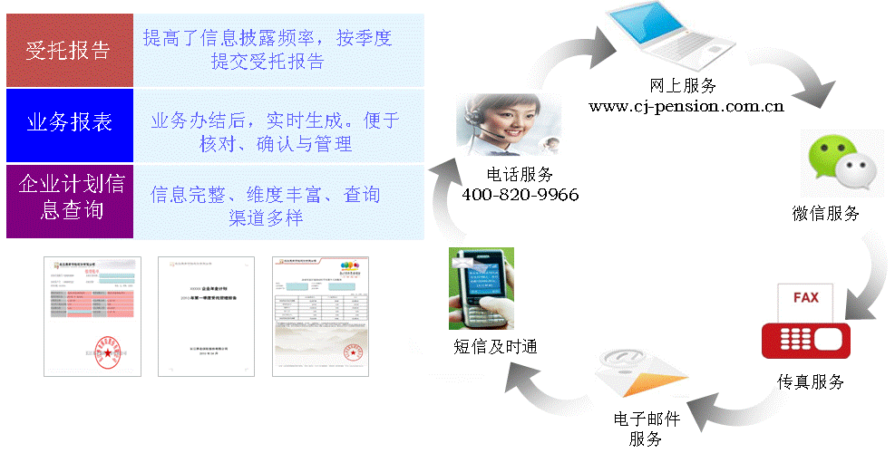 為保證客戶及時了解計劃運作情況,長江養(yǎng)老利用網(wǎng)上、電話、短信、電子郵件、微信等多種現(xiàn)代化的通訊方式提供全方位的查詢披露服務(wù),并能根據(jù)客戶需要量身提供個性化報表服務(wù)。企業(yè)還可自助定制短信及郵件信息種類,長江養(yǎng)老提供包括業(yè)務(wù)辦理結(jié)果提醒、服務(wù)信息通知、問題件提醒等在內(nèi)的短信及郵件服務(wù)。