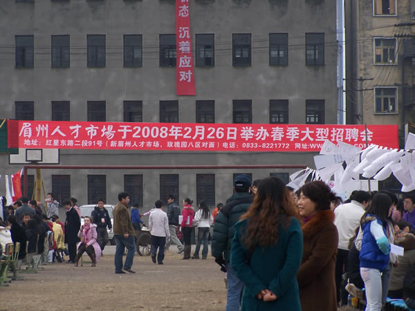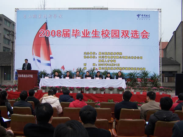 2007年12月31日上午10時(shí),眉州人才市場(chǎng)與眉山職業(yè)技術(shù)學(xué)院聯(lián)合舉辦的“2008屆畢業(yè)生雙選會(huì)”隆重開幕,此次盛會(huì)是眉州人才市場(chǎng)與眉山職業(yè)技術(shù)學(xué)院為解決應(yīng)屆畢業(yè)生就業(yè)的重大舉措,推進(jìn)了該校畢業(yè)生就業(yè)工作,促進(jìn)畢業(yè)生充分就業(yè),為用人單位和畢業(yè)生提供一個(gè)雙向選擇的平臺(tái),此次盛會(huì)有近150家招聘單位蒞臨招聘,2000余名求職者到會(huì)求職。