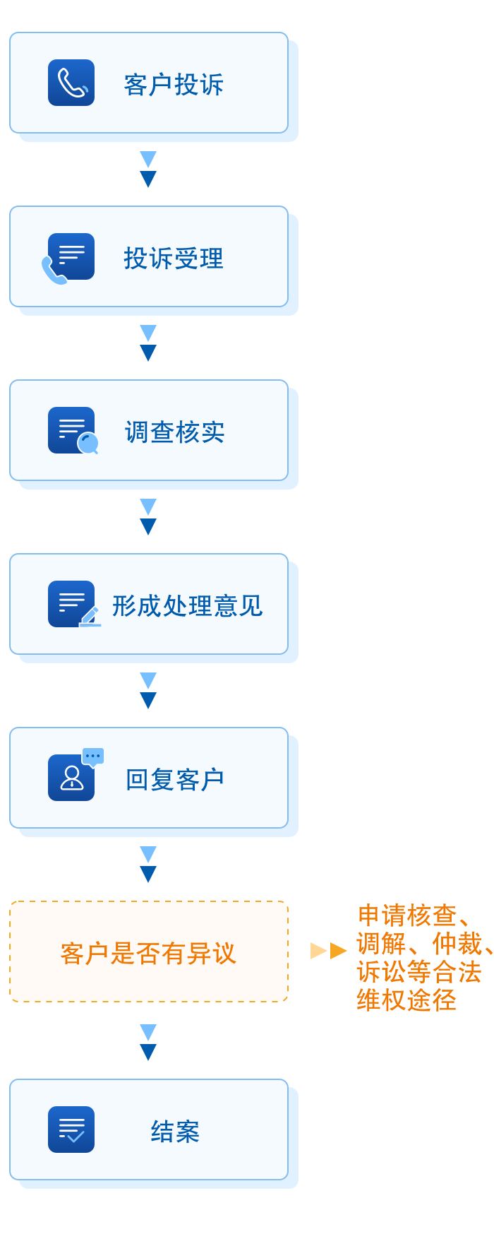 注:如果您對(duì)我們分支機(jī)構(gòu)消費(fèi)投訴處理結(jié)果有異議的,可以自收到處理決定之日起30日內(nèi)向其上級(jí)機(jī)構(gòu)書面申請(qǐng)核查。核查機(jī)構(gòu)應(yīng)當(dāng)對(duì)消費(fèi)投訴處理過(guò)程、處理時(shí)限和處理結(jié)果進(jìn)行核查,自收到核查申請(qǐng)之日起30日內(nèi)作出核查決定并告知投訴人。另外,您也可以通過(guò)調(diào)解、仲裁、訴訟等合法維權(quán)途徑維護(hù)您的權(quán)益。